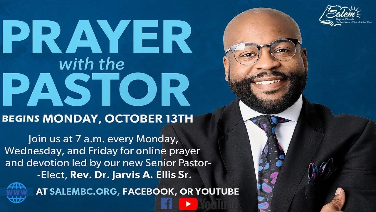 “Prayer with the Pastor” begins Monday, October 13th. Join us at 7 a.m. every Monday, Wednesday, and Friday for online prayer and devotion led by our new Senior Pastor-Elect, Rev. Dr. Jarvis A. Ellis Sr. Stream at salembc.org, Facebook, or YouTube. All are welcome as we begin the day in the Word and in community.