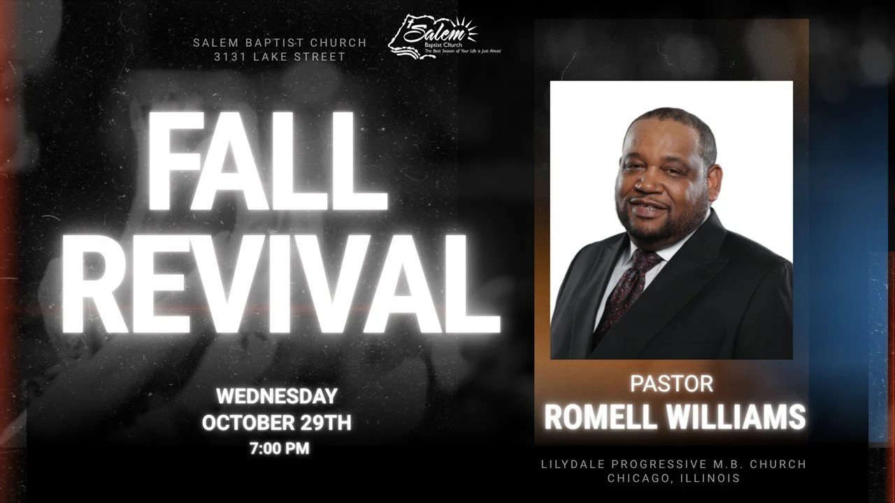 Join us for a powerful evening of worship and renewal as we welcome Pastor Romell Williams of Lilly-Dale Progressive Missionary Baptist Church in Chicago. Come expecting a life changing word, and dynamic worship.