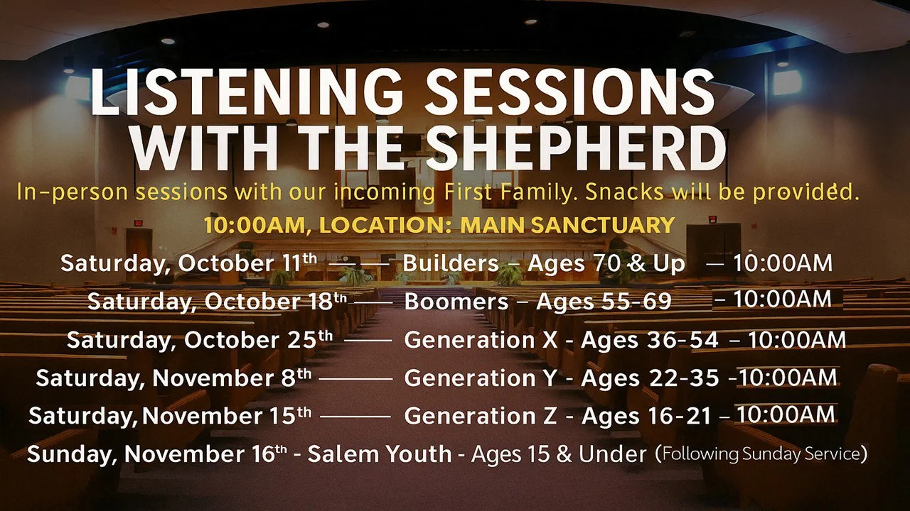 “Listening Sessions with the Shepherd” This month begins a series of in-person sessions with our incoming First Family. Each designated Saturday in October and November, age-based groups will gather here at Salem for open dialogue and personal connection with Pastor Ellis, Lady Ellis, and their son J2. Snacks will be provided. Watch for more details via salembc.org, Constant Contact, and Salem’s social mediachannels.